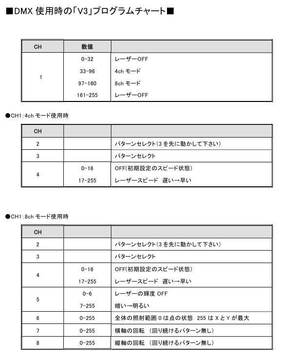 「V3」使用時のDMXチャートは写真3枚目を参照してください。